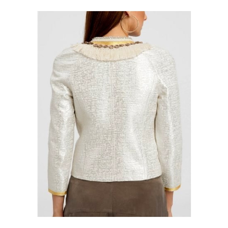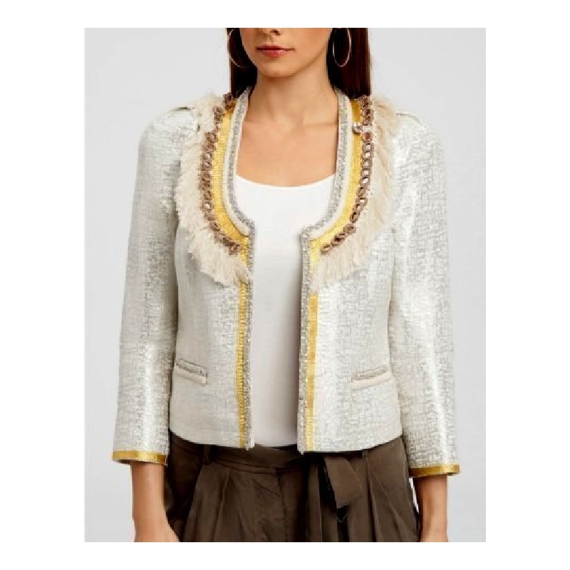 Sacou scurt din brocart, cu umeri proeminenti si ornat cu cristale, paiete si franjuri
