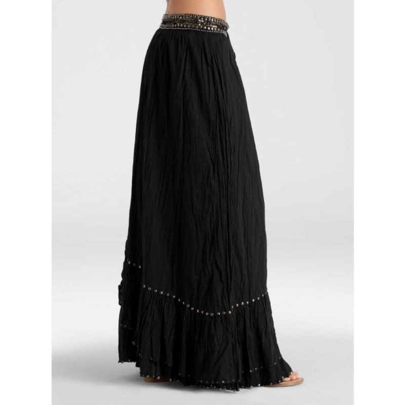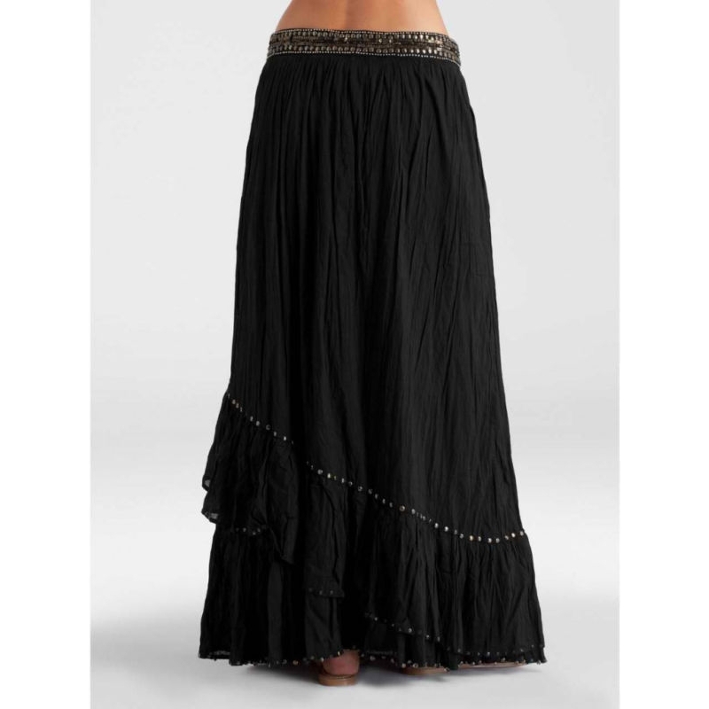 - Fusta gypsy maxi, cu volane asimetrice si paiete metalice cusute.