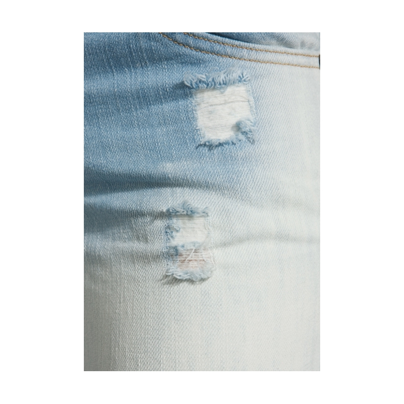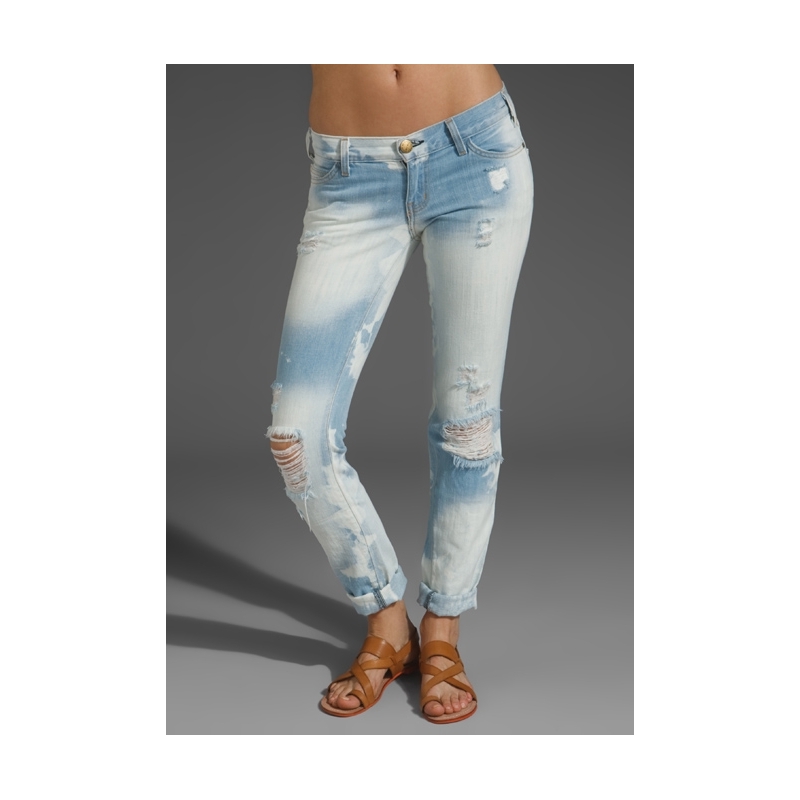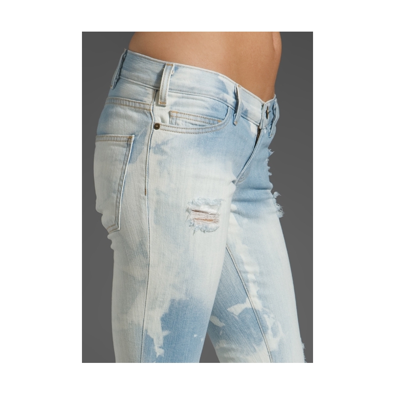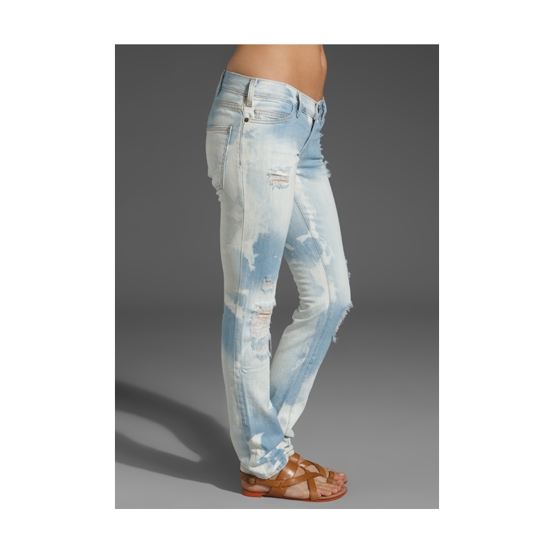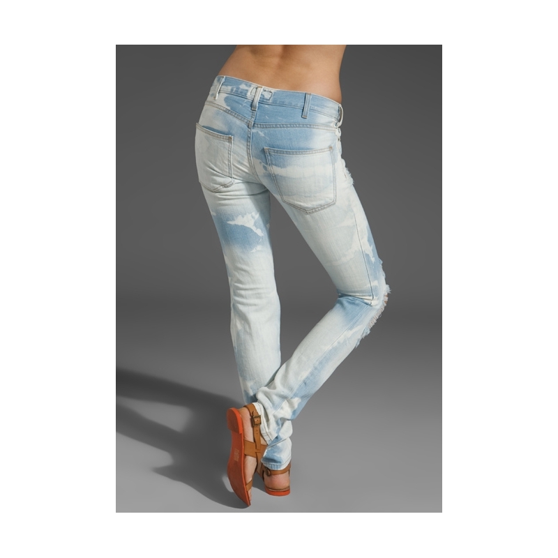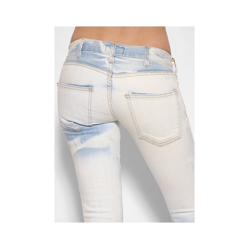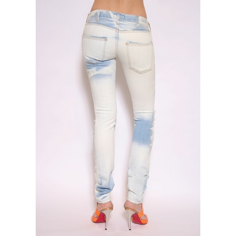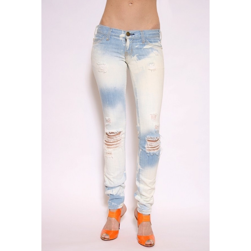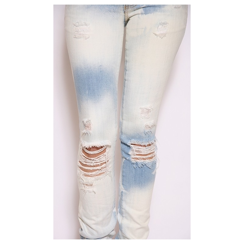- Blugi skinny decolorati, cu rupturi.
