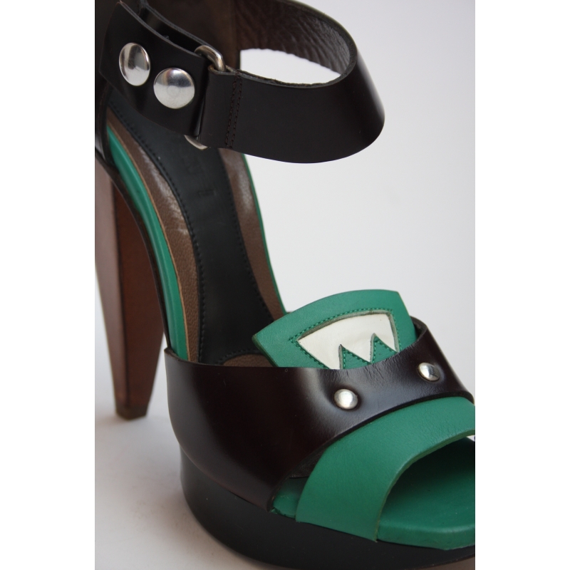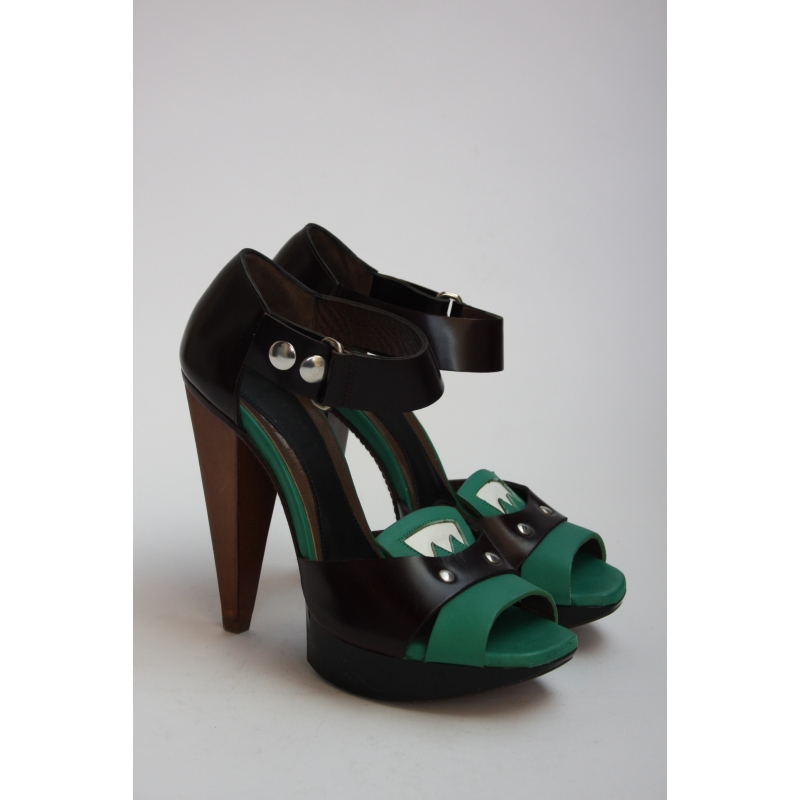- Sandale cu bareta lata pe glezna, platforma si toc conic, imbracat in piele.
