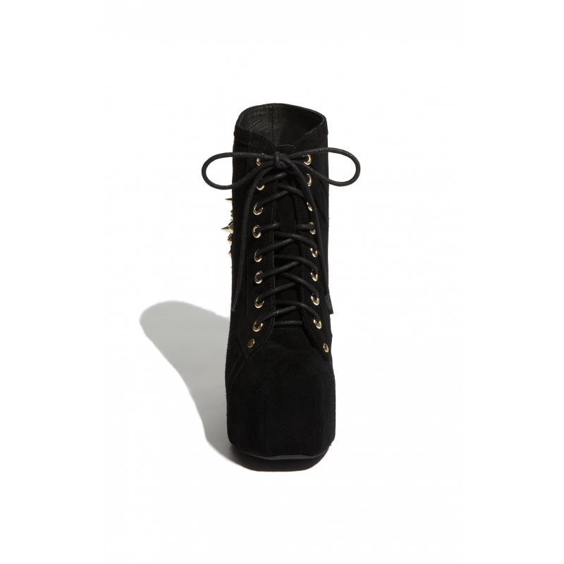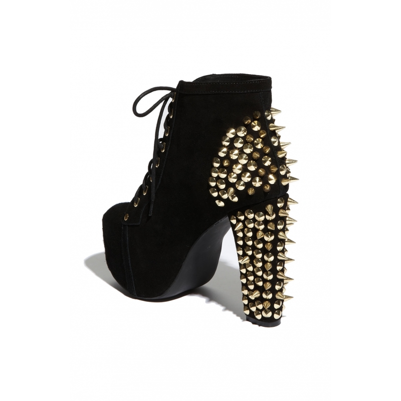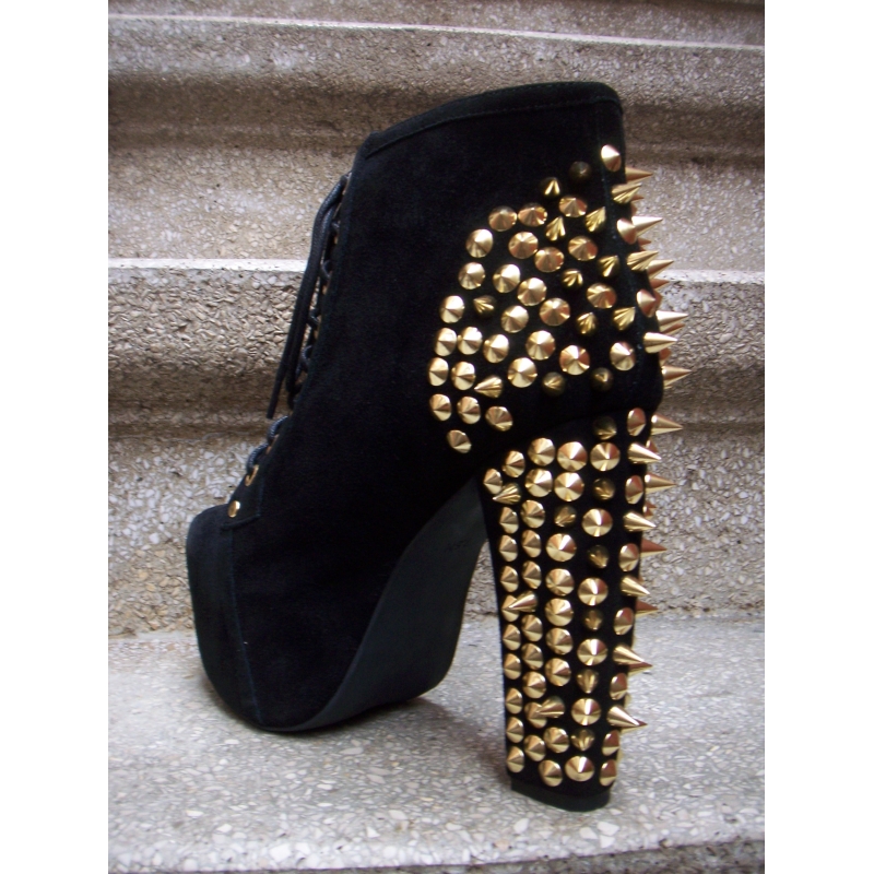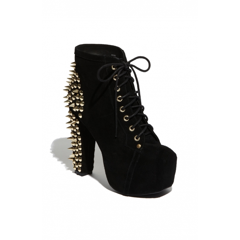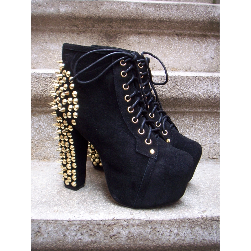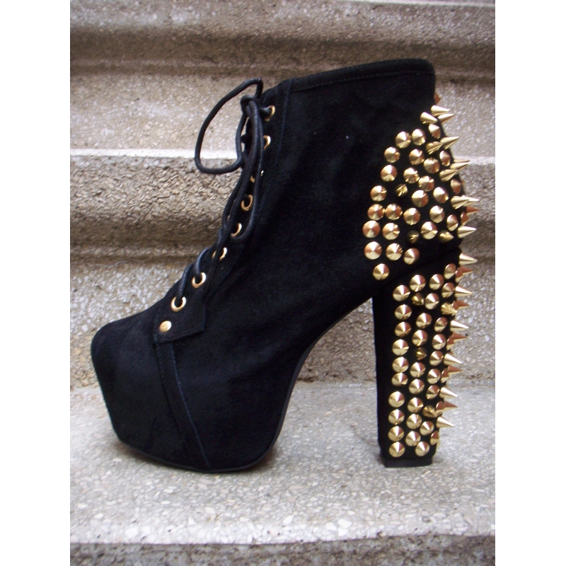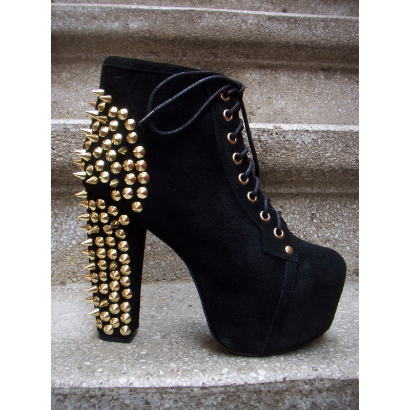 - Botine din piele cu platforma ascunsa si toc bloc, accesorizat cu tinte si tepi.