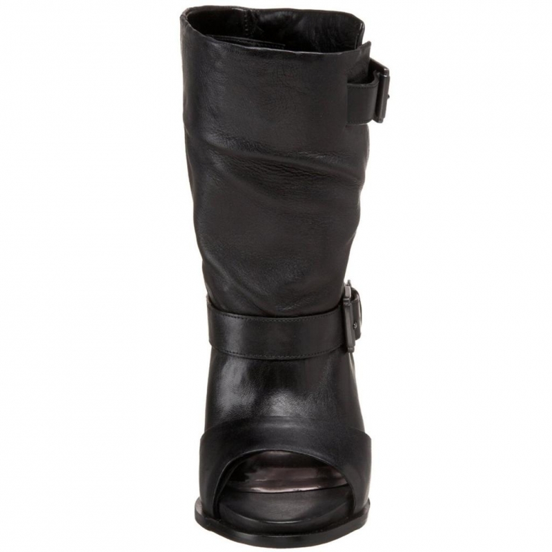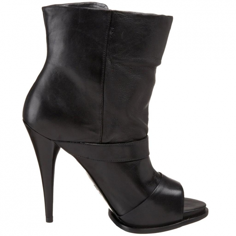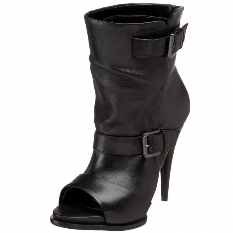 - Botine din piele, cu varf decupat si toc conic, accesorizate cu catarame.