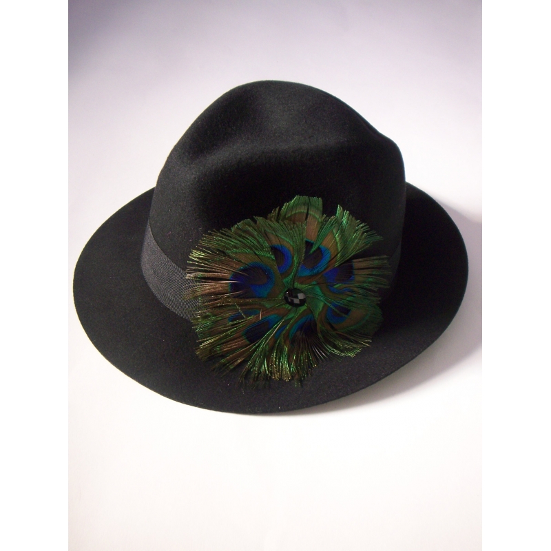 - Palarie fedora din lana, accesorizata cu pene naturale.