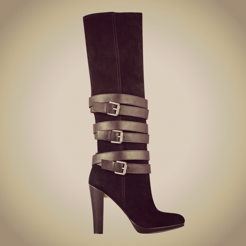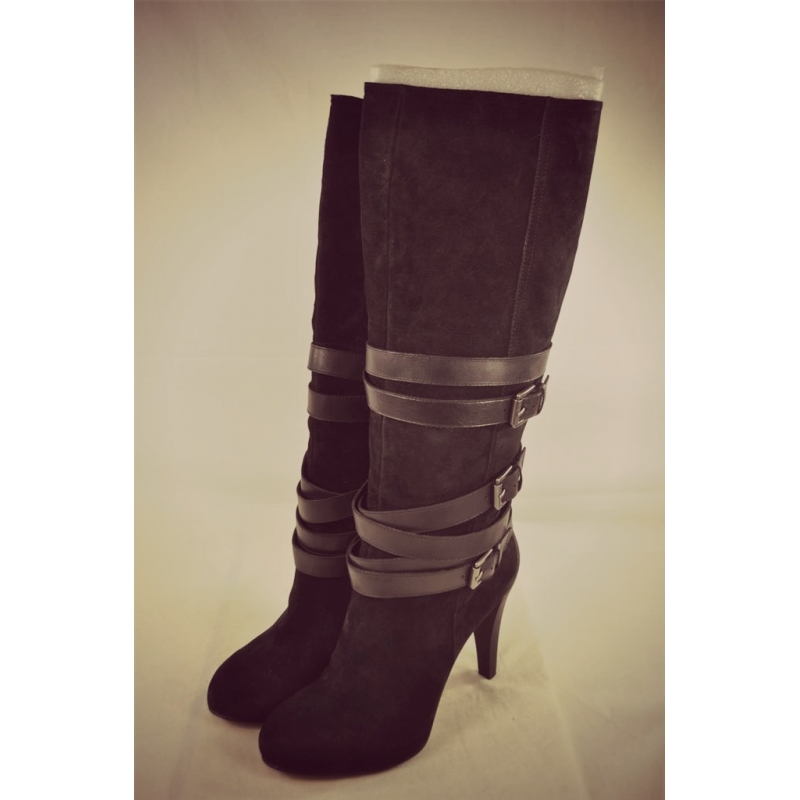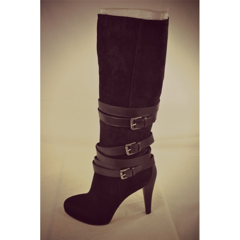 Cizme inalta din piele intoarsa, cu toc gros, accesorizate cu barete duble cu catarame metalice
