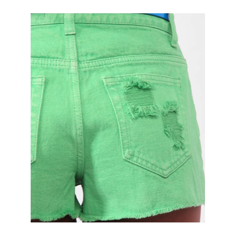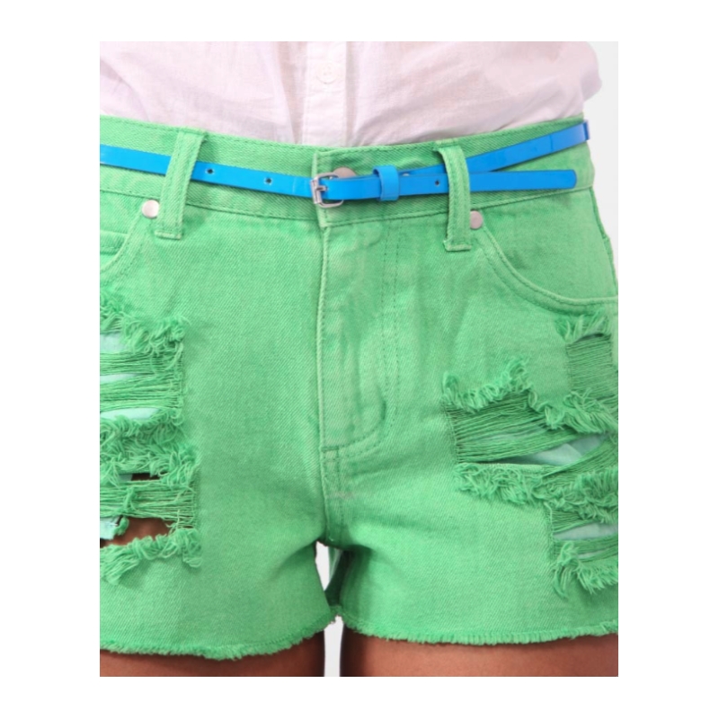 Pantaloni scurti din denim neon, cu talie inalta, rupturi si curea lacuita