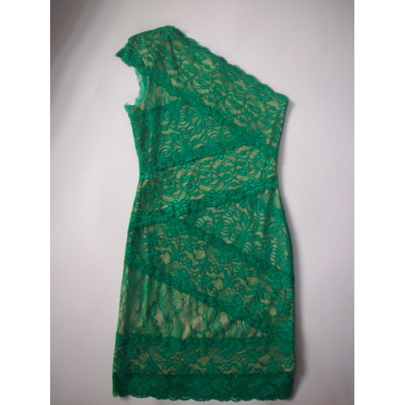 Rochie bandage, din dantela neon, asimetrica.