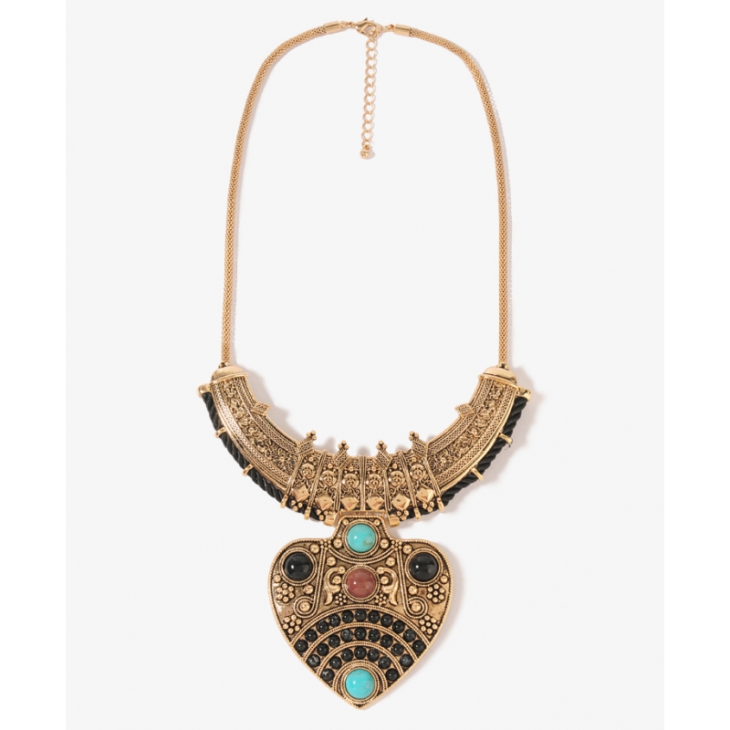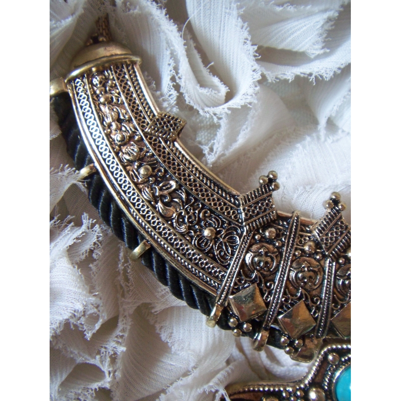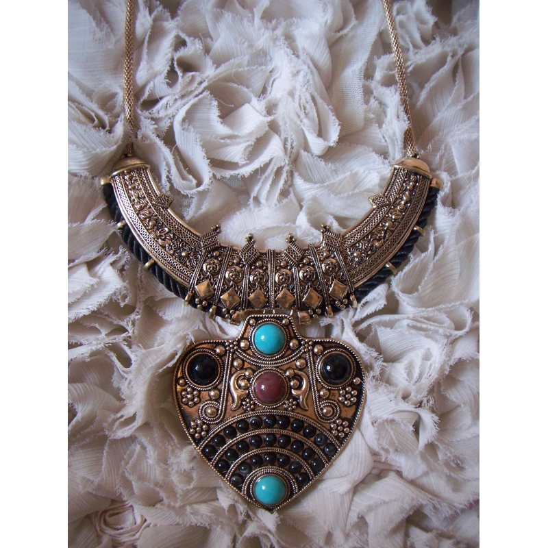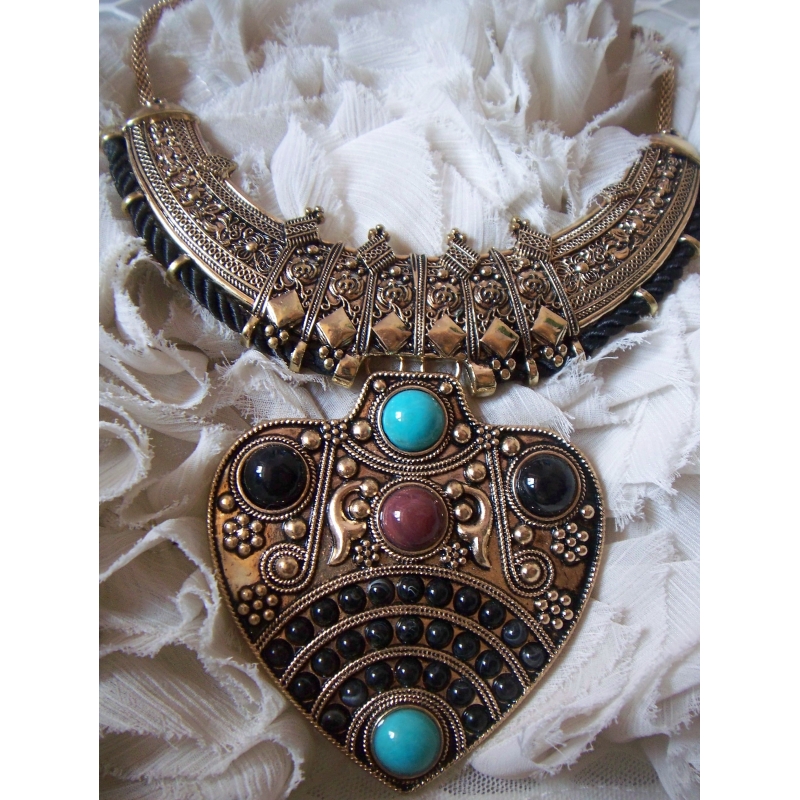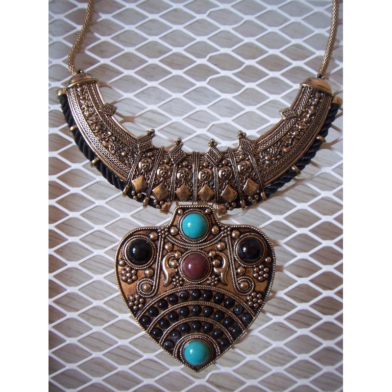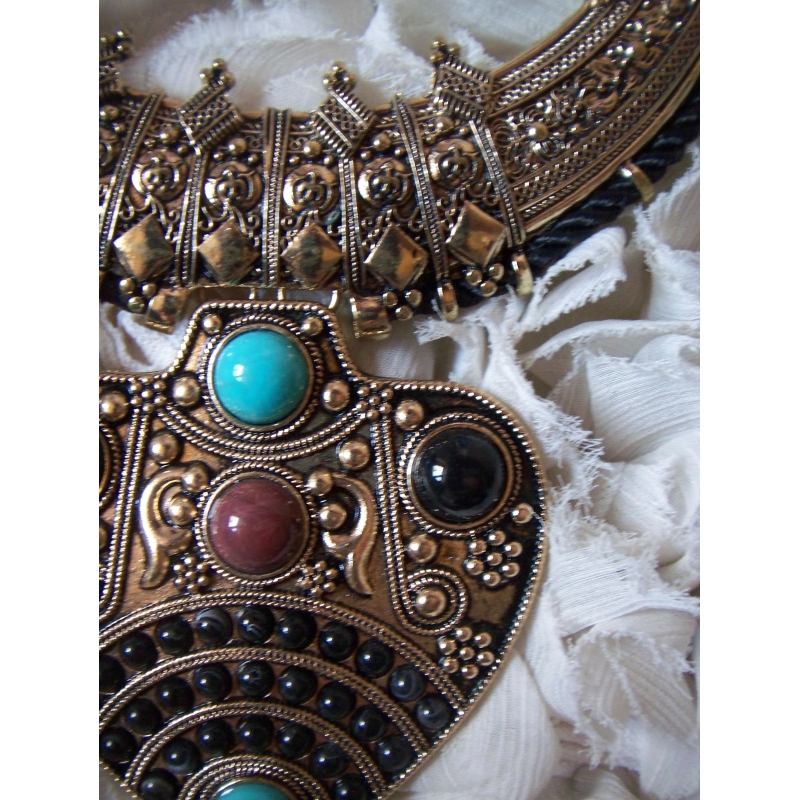 Colier la baza gatului cu placa metalica supradimensionata, impodobita cu pietre si motive tribale
