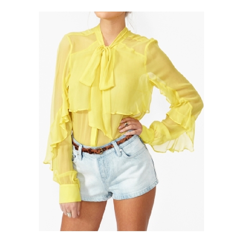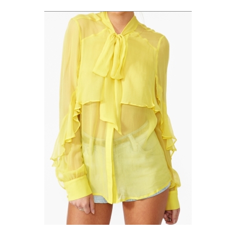 - Camasa transparenta, cu volane pe maneci si esarfa ingusta atasata.